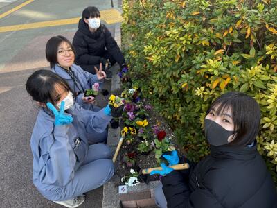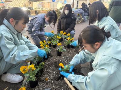 1月18日(土)8時から、藍場浜公園周辺で新町川を守る会が主催する、「とくしままちなか花ロードProject」が開催されました。晴天に恵まれ、本校から22名の生徒を含む、総勢300人以上が参加し、合計4万株を超えるパンジーやビオラを定植しました。