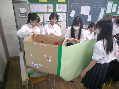 先週に引き続き、"届けよう、服のチカラ”プロジェクトのポスターや回収箱を、完成に向け作っている様子です。来週には加茂名幼稚園、若松こども園、城西高校の農産物販売所「そよかぜ」、事務室前、職員室前に回収ボックスを設置する予定です。回収期間は、9/24~10/29です。着なくなった子供服がございましたら、寄付にご協力をお願いします。